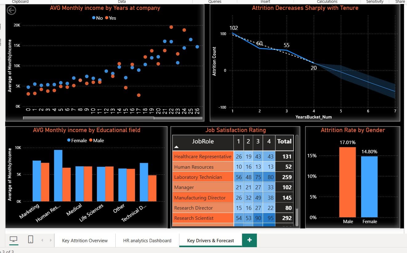 - Key Drivers & Retention Forecast – Income vs tenure, job satisfaction heat-map, gender rate, tenure-based attrition forecast