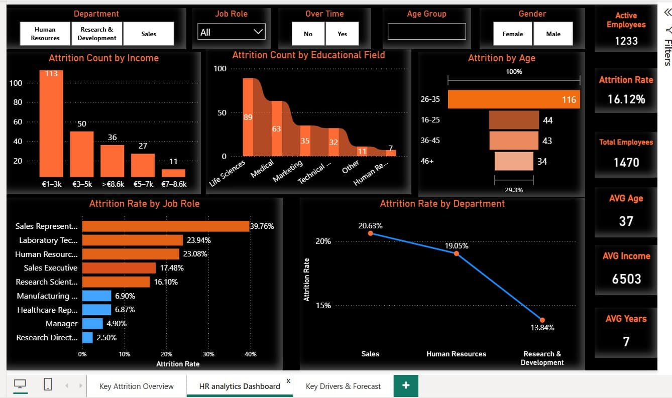- Highest-risk roles: Sales Representatives (39.7%), Laboratory Technicians (23.9%), HR (23.0%)