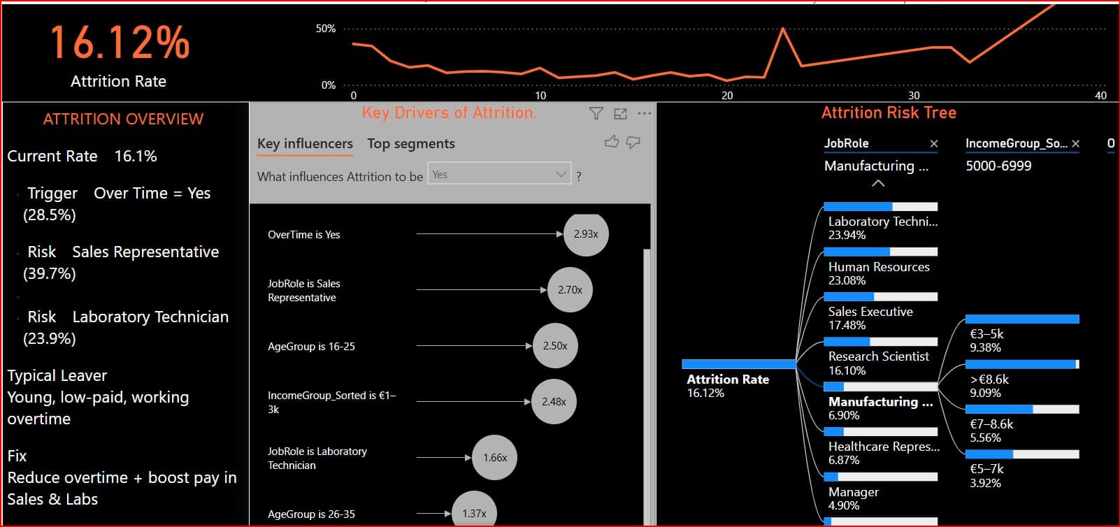 - Attrition Overview & Risk Drivers – KPI, risk tree, key influencers, actionable recommendations